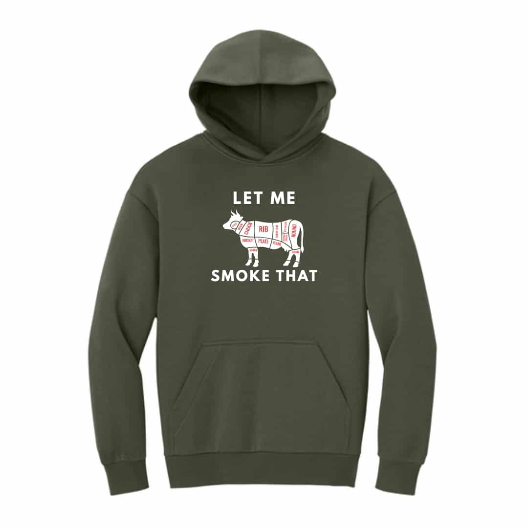 The BBQ Warrior Let Me Smoke That Sweatshirt combines pitmaster pride with premium comfort. Printed on a rich dark olive green base, it features bold curved text reading “Let Me Smoke That” wrapped around a centered white cow silhouette — a nod to the ultimate BBQ challenge.